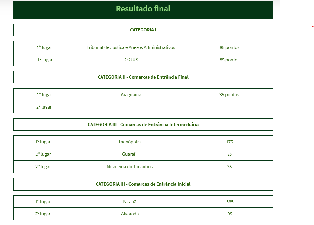Na Categoria I, que reúne o Tribunal de Justiça, anexos administrativos, Corregedoria-Geral da Justiça, Esmat e NAPsi, o primeiro lugar registrou empate entre Tribunal de Justiça e Anexos Administrativos e CGJUS, ambos com 85 pontos. Entre as comarcas de entrância final, Araguaína lidera a classificação preliminar com 35 pontos.
