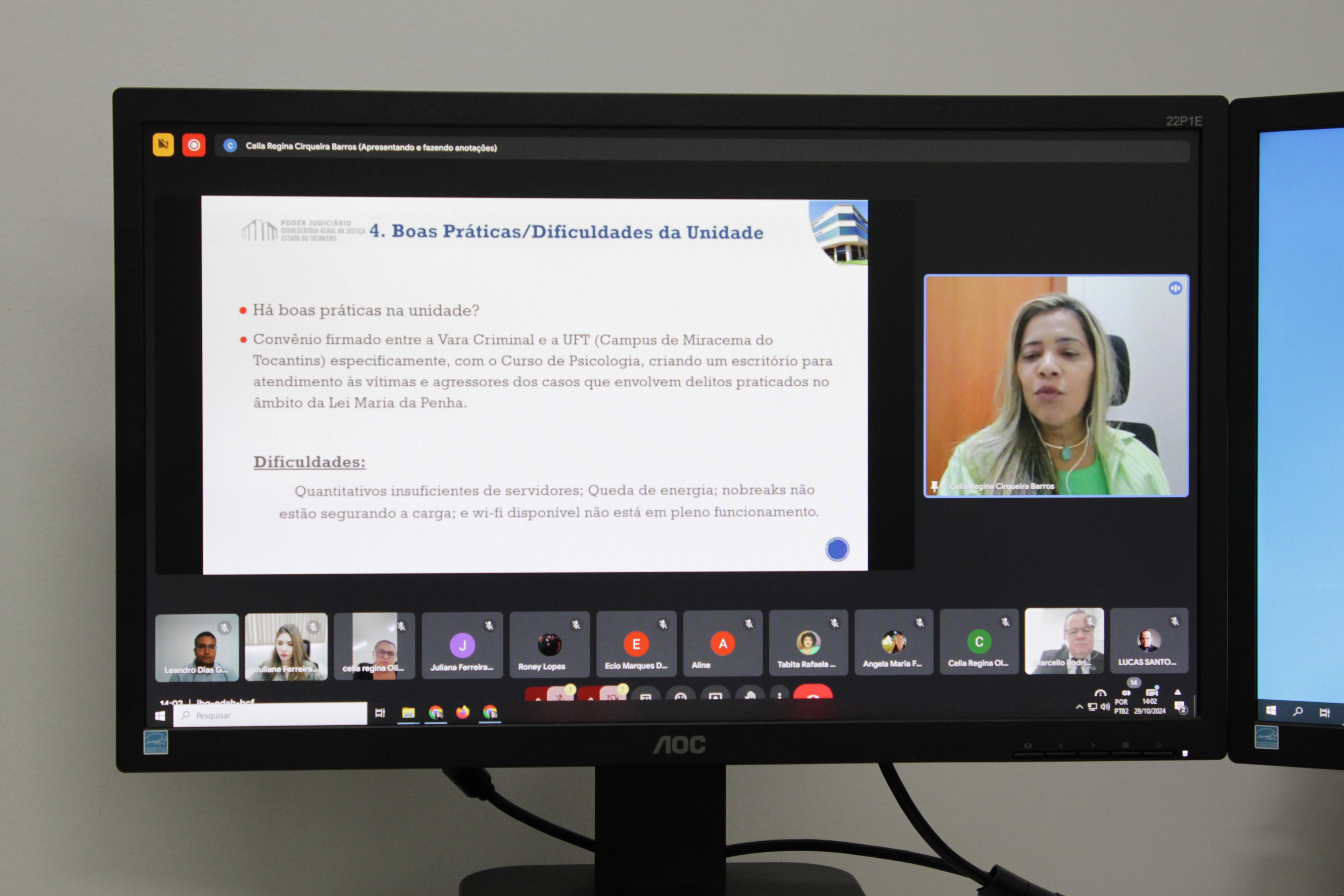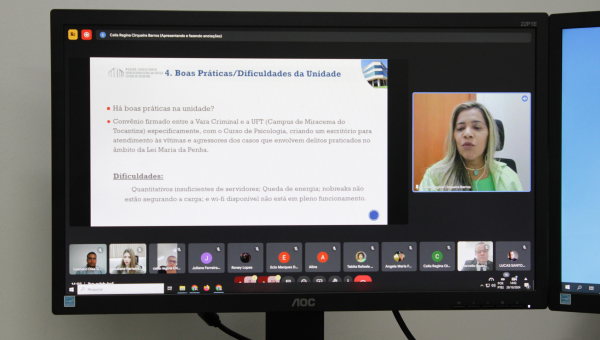 A primeira reunião foi com o juiz diretor do Foro, Marcelo Rodrigues de Ataídes, titular da 1ª Vara Criminal de Miracema, e servidores que atuam na unidade. Durante a videoconferência, a servidora Célia Regina Cirqueira Barros, assistente de Apoio ao Serviço Judicial e Administrativo da Cplan, apresentou os principais resultados da análise por amostragem feita pela equipe correcional, divididos em tópicos como atendimento ao público, alimentação dos sistemas, cumprimento de metas, organização e metodologia de trabalho.