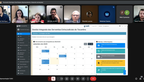 Também participaram do encontro o juiz auxiliar da Corregedoria de Goiás, dr. Társio Ricardo de Oliveira Freitas, e servidores que atuam com os serviços extrajudiciais no estado vizinho. A apresentação contou ainda com o apoio do chefe da Divisão de Fiscalização e Monitoramento, Fernando César Oliveira, e da equipe da Diretoria de Tecnologia da Informação do TJTO, formada pelos servidores Harly Carreiro, Fernando Henrique e Fernando Noleto, responsáveis pelo desenvolvimento do sistema.