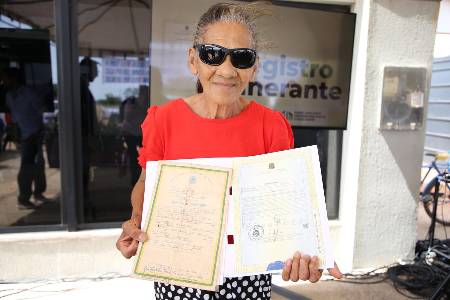 Já a dona Carmelita Clementina era uma das mais animadas por ter conseguido emitir a segunda via de sua certidão de casamento, datada de 8 de julho de 1948. “Hoje, graças a Deus, eu conferi e está tudo certo com minha certidão nova”, celebrou.