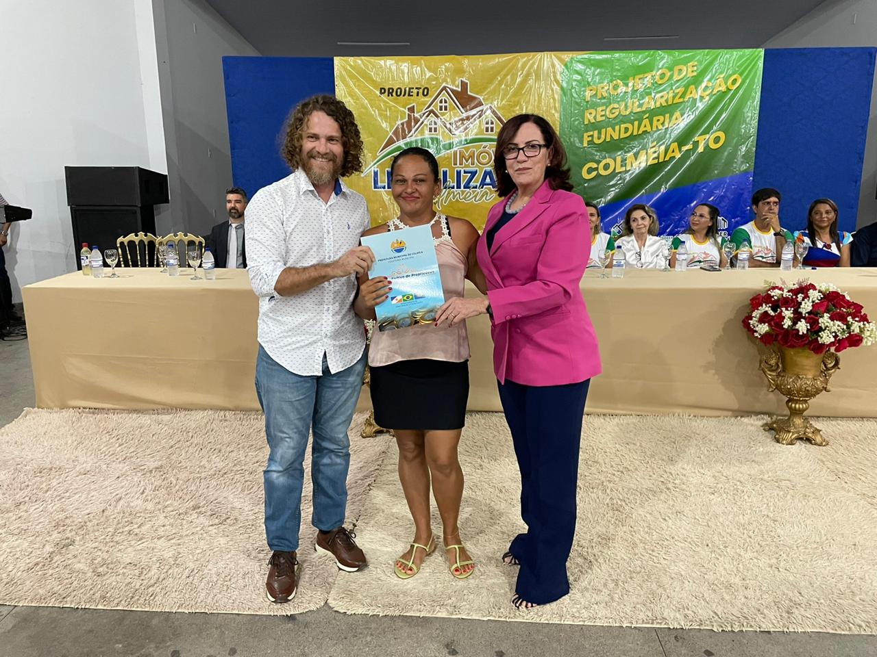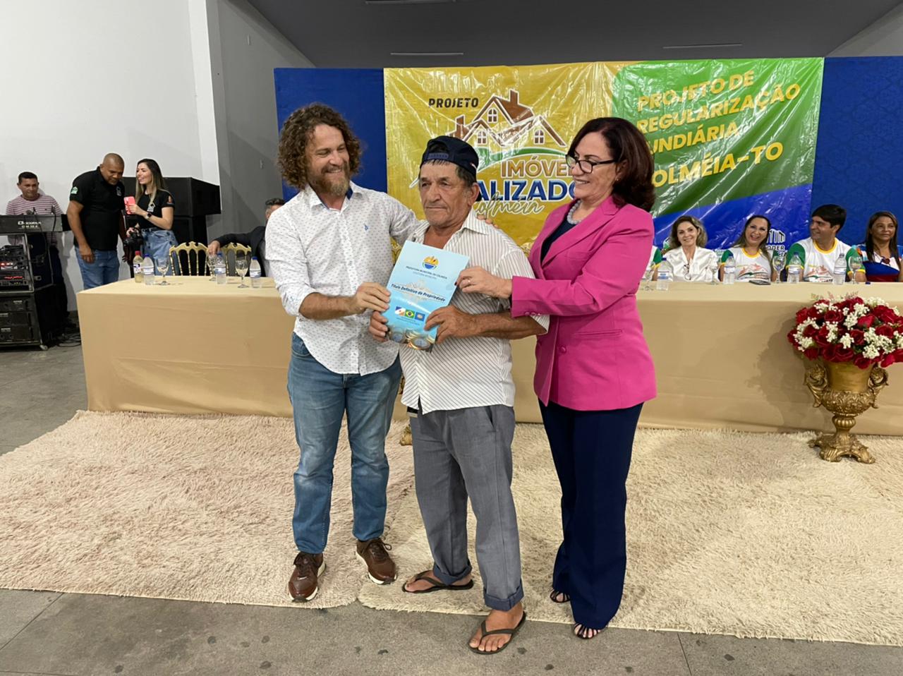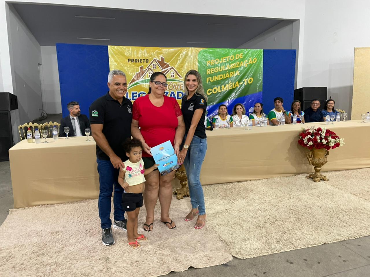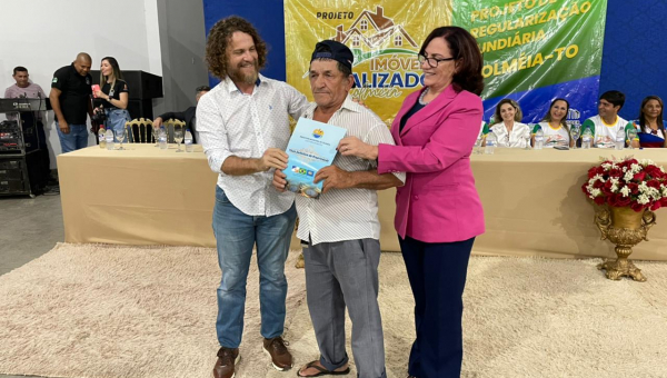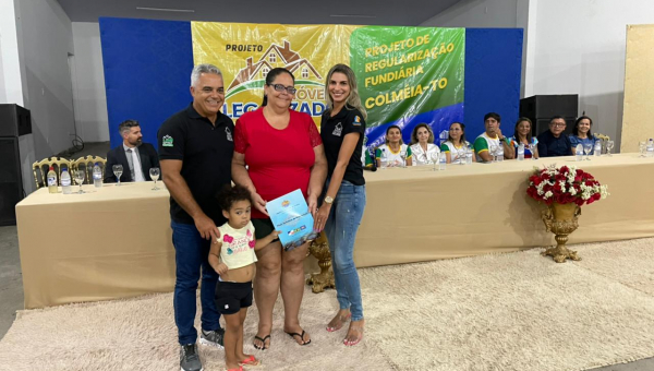 Aconteceu na última segunda-feira, 23/01, a cerimônia de entrega de títulos definitivos de propriedade do Setor Tião Catalão, em Colméia, região norte do Tocantins. Cerca de 70 famílias foram contempladas com os títulos de propriedade. Ao lado do Prefeito Joactã José dos Reis e do Juiz Marcelo Eliseu Rostirolla, titular da Comarca de Colméia, a corregedora-geral da Justiça e presidente eleita do Tribunal de Justiça do Tocantins, desembargadora Etelvina Maria Sampaio Felipe, e o juiz auxiliar da Presidência do Tribunal de Justiça do Tocantins (TJTO) e coordenador do Núcleo de Prevenção e Regularização Fundiária (Nupref), Océlio Nobre, estiveram presentes no evento.