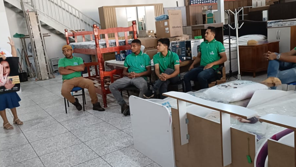 Profissional credenciada ao GGEM fala sobre a Campanha Sinal Vermelho para funcionários de uma loja de materiais de construção, em Palmas