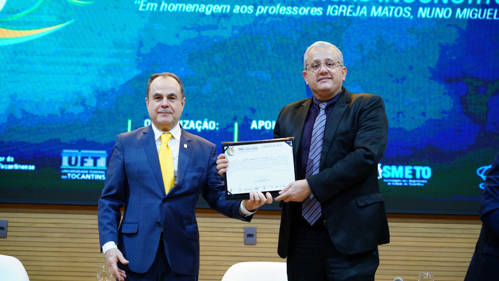 Ao final do painel, o doutor Mohamed Jaouhar foi homenageado com o Medalhão da ESMAT, em reconhecimento à sua colaboração com as atividades da escola e o engrandecimento do Poder Judiciário do Tocantins. A homenagem foi entregue pelo desembargador Marco Villas Boas, diretor-geral da Escola.