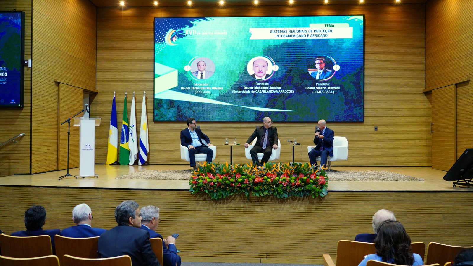 O painel sobre os desafios e os avanços dos sistemas de proteção dos direitos humanos na América e na África encerrou a programação do segundo dia do XVII Congresso Internacional em Direitos Humanos – o Estado de Coisas Inconstitucional, nesta quinta-feira (3/10). O tema foi abordado pelo doutor Mohamed Jaouhar, da Universidade de Casablanca/Marrocos, e pelo doutor Valério Mazzuoli, da Universidade Federal de Mato Grosso/Brasil, e teve como moderador o doutor Tarsis Barreto Oliveira (PPGPJDH).