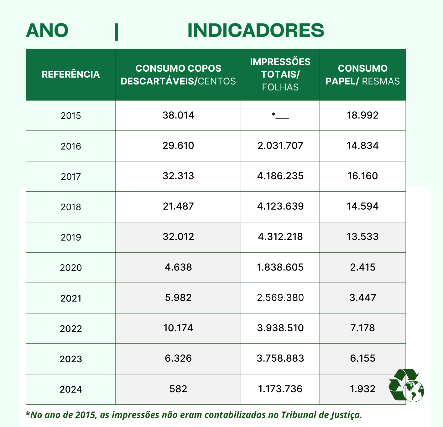 O detalhamento dos dados dos principais indicadores que impactam diretamente no meio ambiente e que tiveram redução expressiva, intitulado Impressões Totais, pode ser conferido na tabela a seguir: