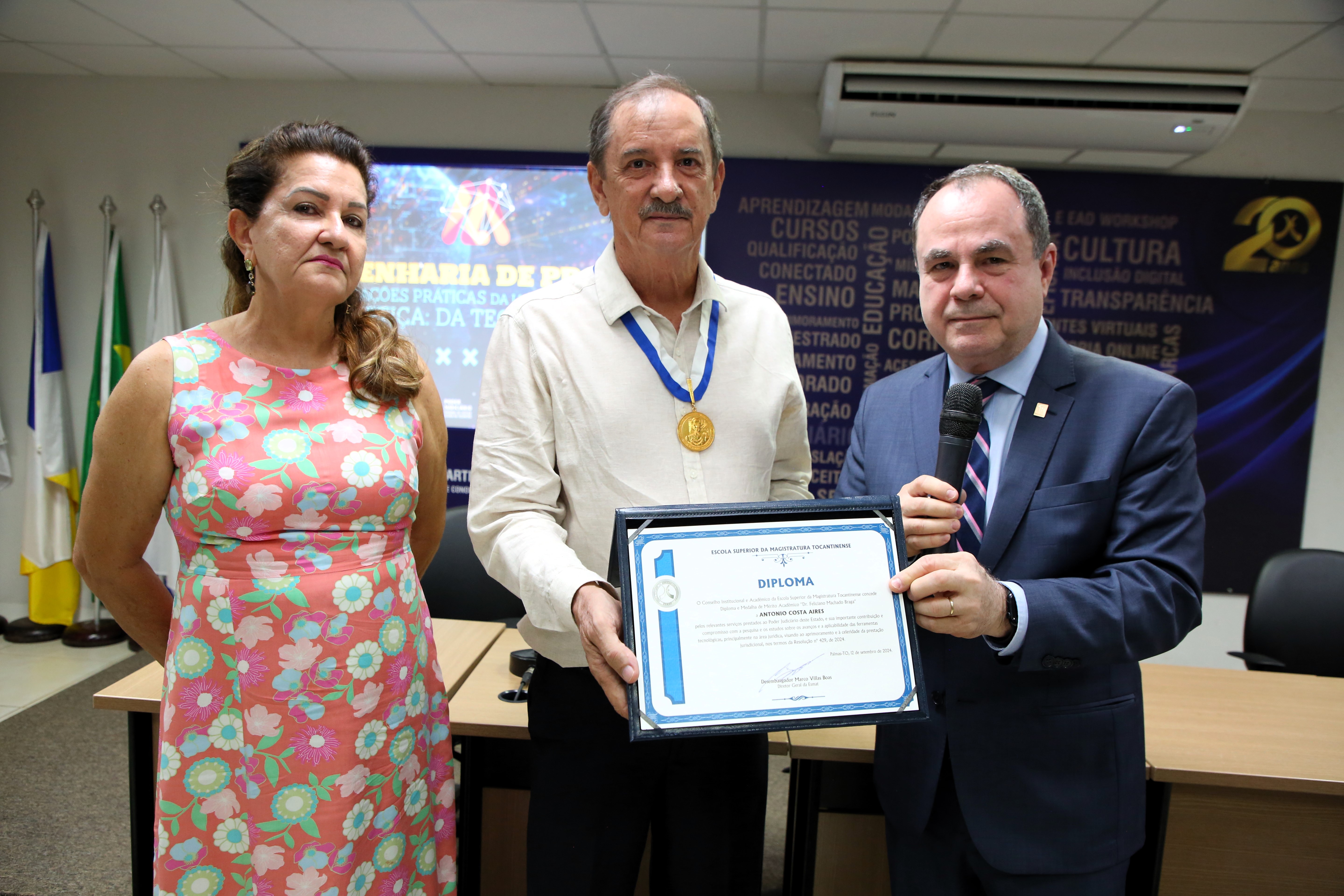 Na ocasião, foi outorgada a Medalha de Mérito Acadêmico "Dr. Feliciano Machado Braga" ao jornalista e administrador, o servidor público da Justiça Federal Antonio Costa Aires. A Esmat concedeu a honraria como reconhecimento pelo comprometimento e contribuição à Justiça tocantinense. A medalha destaca personalidades cujas trajetórias e esforços contribuem significativamente para o avanço do conhecimento e da inovação no Poder Judiciário, reafirmando o compromisso com o aprimoramento contínuo da prática jurídica e a promoção da justiça.
