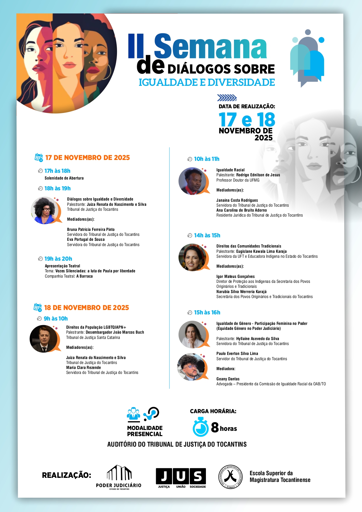 Nos dias 17 e 18 de novembro, o Tribunal de Justiça do Tocantins promove a II Semana de Diálogos sobre Igualdade e Diversidade, iniciativa da Escola Superior da Magistratura Tocantinense (Esmat). A programação é gratuita, será realizada presencialmente no auditório do TJTO, com transmissão simultânea, e as inscrições já estão abertas.