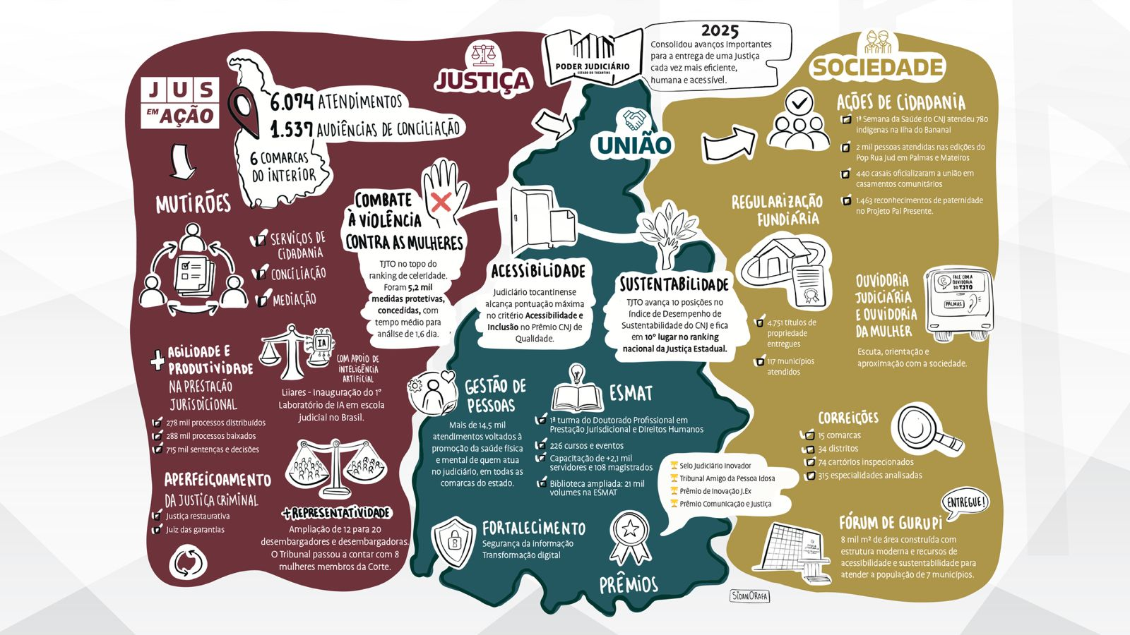 Pela primeira vez, o Poder Judiciário tocantinense publica uma versão impressa, em linguagem simples, do relatório de atividades. Apresentada na abertura do Ano Judiciário, nesta segunda-feira (02/02), a ilustração traz as principais ações realizadas em 2025 pelo Tribunal de Justiça (TJTO), Corregedoria-Geral da Justiça (CGJUS), Ouvidoria Judiciária e Ouvidoria da Mulher e Escola Superior da Magistratura Tocantinense (ESMAT).
