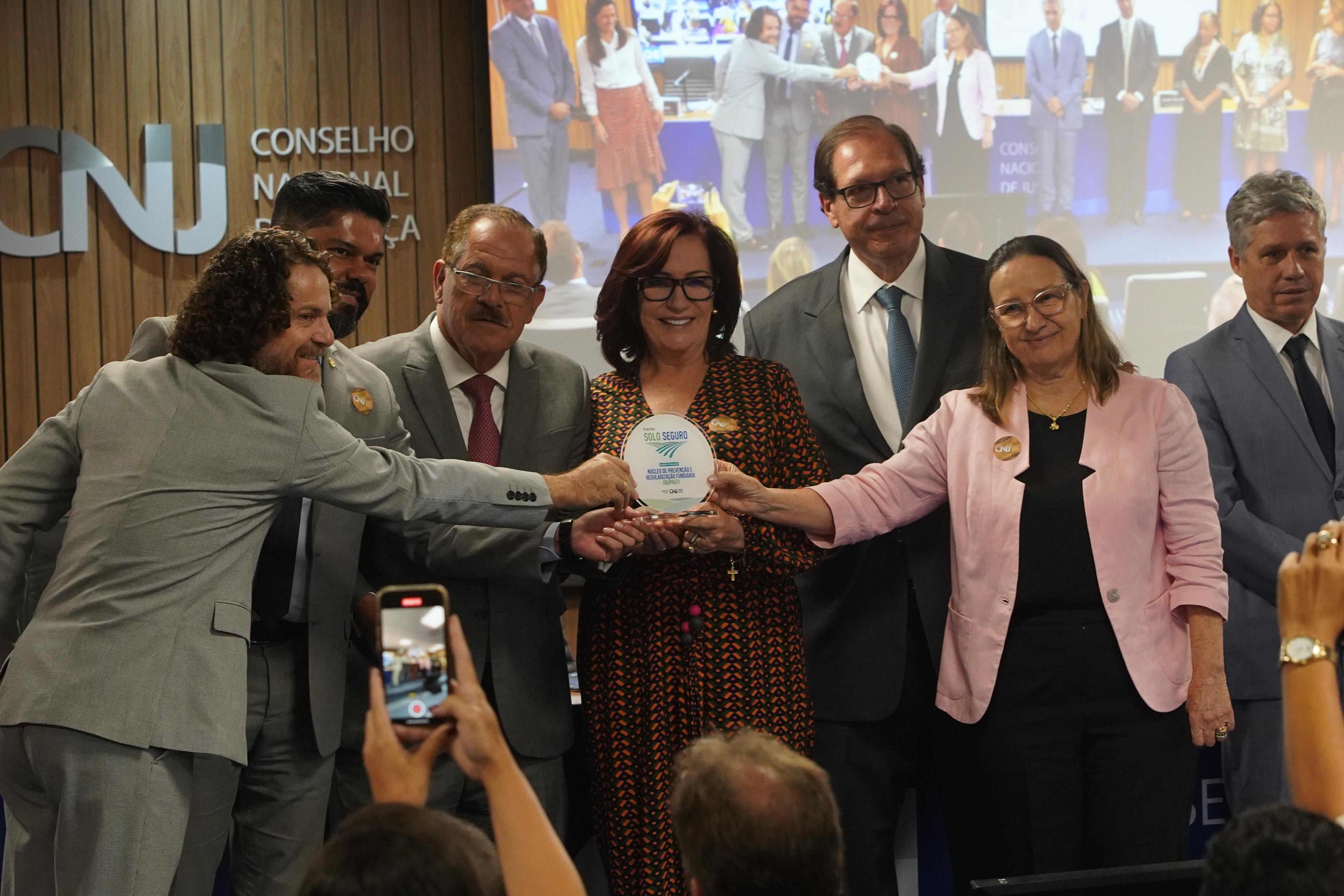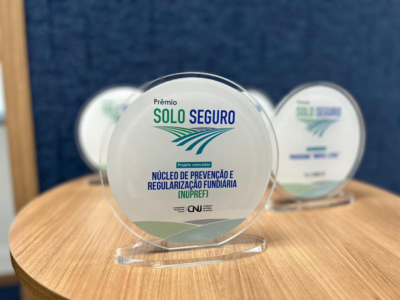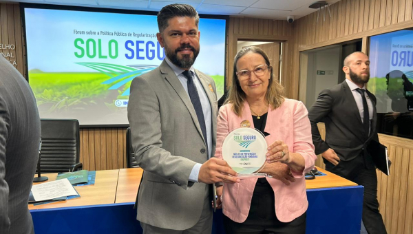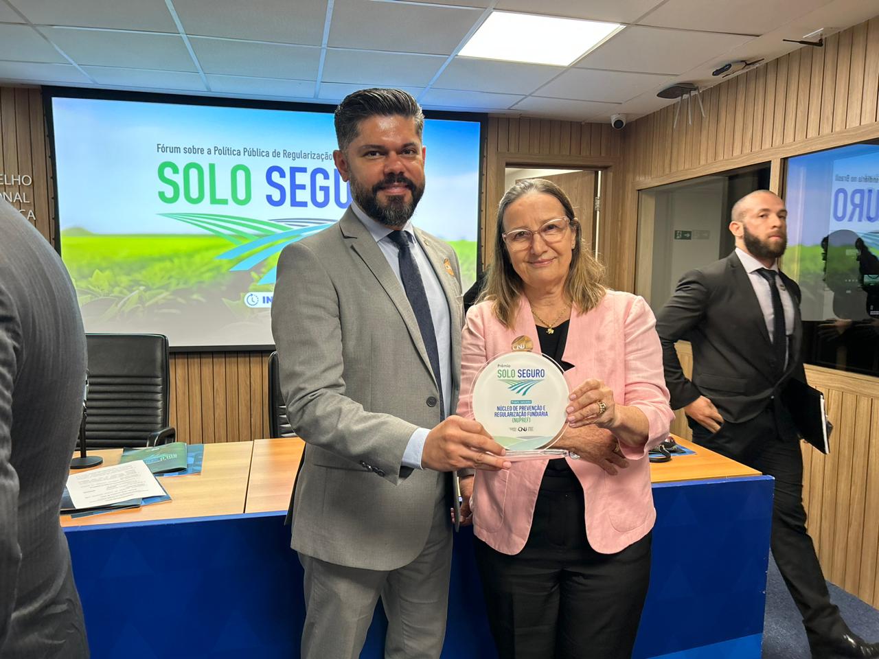 O Poder Judiciário do Tocantins recebeu da Corregedoria Nacional de Justiça, nesta quarta-feira (18/10), o Prêmio Solo Seguro. Reconhecimento às ações realizadas pelo Núcleo de Prevenção e Regularização Fundiária do Tocantins (Nupref/CGJUS) foi entregue durante o Fórum sobre Política Pública de Regularização Fundiária no Brasil, em Brasília. Participaram da solenidade a presidente do Tribunal de Justiça do Tocantins, desembargadora Etelvina Maria Sampaio Felipe; a corregedora-geral da Justiça, desembargadora Maysa Vendramini Rosal; o juiz coordenador do Nupref, Wellington Magalhães; e os juízes Océlio Nobre, que atuou na implantação do Núcleo no Judiciário tocantinense, e Ronicley Alves de Moraes (juiz auxiliar da Presidência).