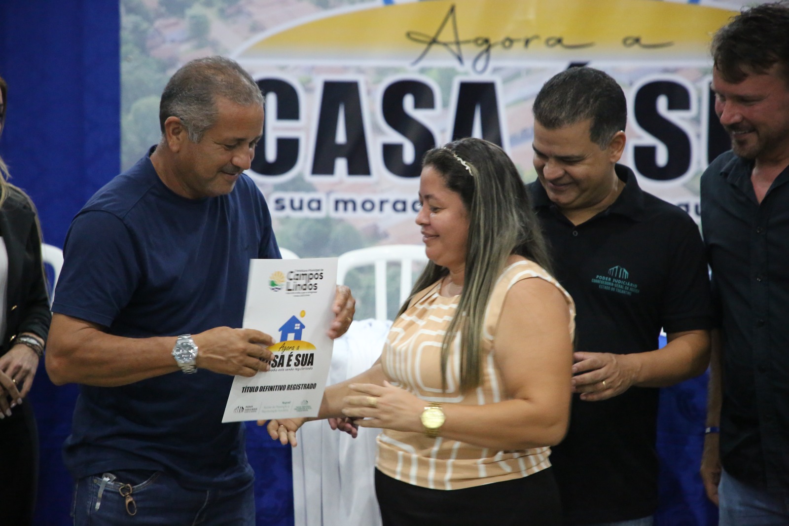 “É uma vitória nossa, de cada morador, de cada família que nunca desistiu. A nossa cidade cresce junto com a gente, e a gente cresce com ela. Muito obrigado por esse momento, por essa conquista que muda vidas”, disse o morador Iris da Silva Pontes durante a entrega de 150 títulos de propriedade a famílias do Setor Centro – 3ª etapa, em Campos Lindos, na noite desta quinta-feira (27/03), durante a 4ª Semana Nacional de Regularização Fundiária – Solo Seguro Amazônia Legal.
