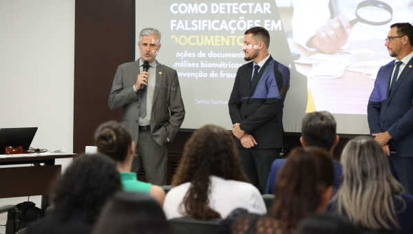 “Como detectar falsificações em documentos”. Este foi o tema da palestra proferida pelo papiloscopista João Carlos Santiago Nery na capacitação oferecida pelo cartório. Evento foi aberto pelo juiz auxiliar da CGJUS, Esmar Custódio, que falou sobre a atuação da corregedoria e  destacou a relevância do encontro para quem atua nos serviços extrajudiciais. “O judiciário tem evoluído na questão da segurança, com mecanismos como o selo digital, que permite a conferência da autenticidade dos atos praticados. Mas a verificação dos documentos tem que ser cada vez mais eficiente para evitar novas fraudes e por isso um debate como este é de extrema importância, tanto para os cartórios evitarem prejuízos, quanto para o usuário, que também é prejudicado”, afirmou.
