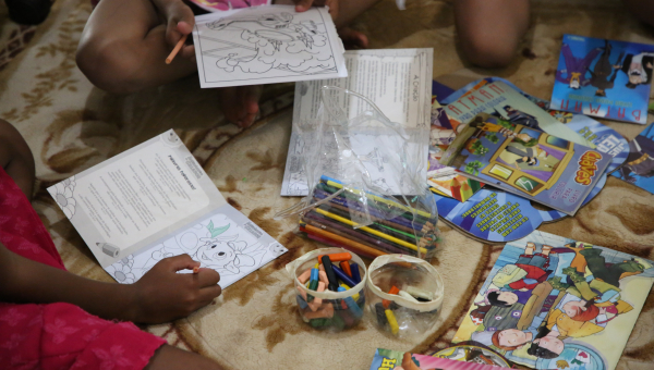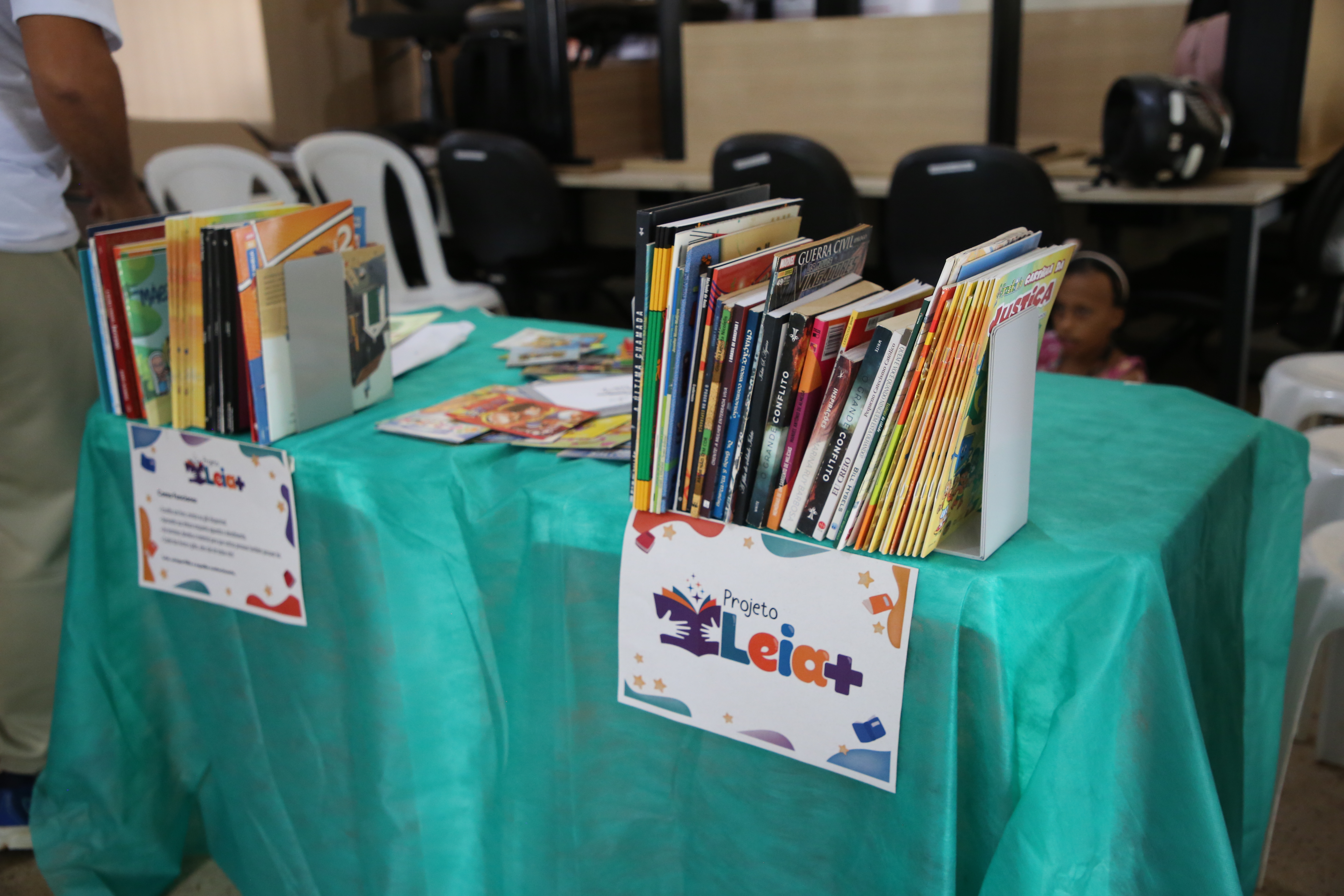 Enquanto pais e responsáveis aguardam atendimento, o espaço também se organiza para acolher as crianças e adolescentes. Em meio à espera, os livros ajudam a preencher o tempo e criam outra dinâmica no ambiente. Entre as crianças que passaram pela manhã no Cras Karajá, uma delas aprendeu a ler no ano passado e já está no segundo livro. O espaço acaba funcionando não só como apoio durante o atendimento, mas como um incentivo ao contato com a leitura desde cedo.