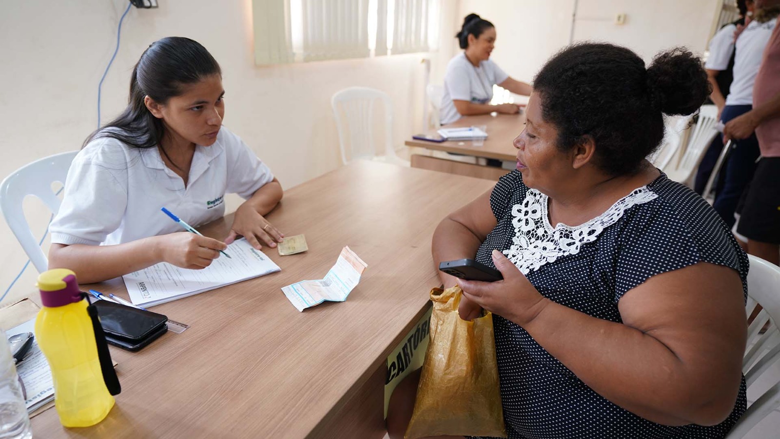 A certidão de nascimento da Treyce Kelly Pantoja Farias é de Belém (PA). Ela e o pai estiveram no Cras Krahô para atualizar o documento e incluir o nome dele na certidão. “Como ir a Belém é mais difícil e não temos condições de ir, vamos resolver aqui que não precisa gastar”.