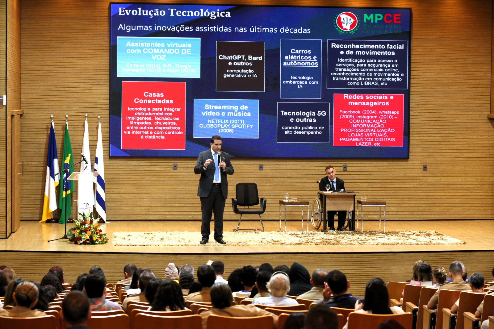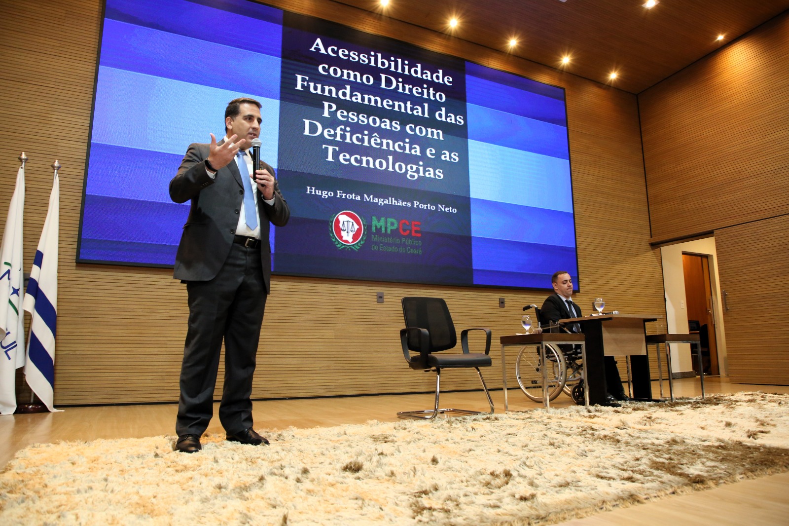 Desenvolvida pelo doutor Hugo Frota Magalhães Porto Neto, promotor de justiça do Ministério Público do Ceará, a primeira palestra com o tema A acessibilidade como direito fundamental das pessoas com deficiência e as tecnologias: cidades inteligentes e uma sociedade infoinclusiva abordou alguns exemplos de iniciativas de inclusão digital para pessoas com deficiência, além de apontar os benefícios de uma sociedade infoinclusiva para todos(as).