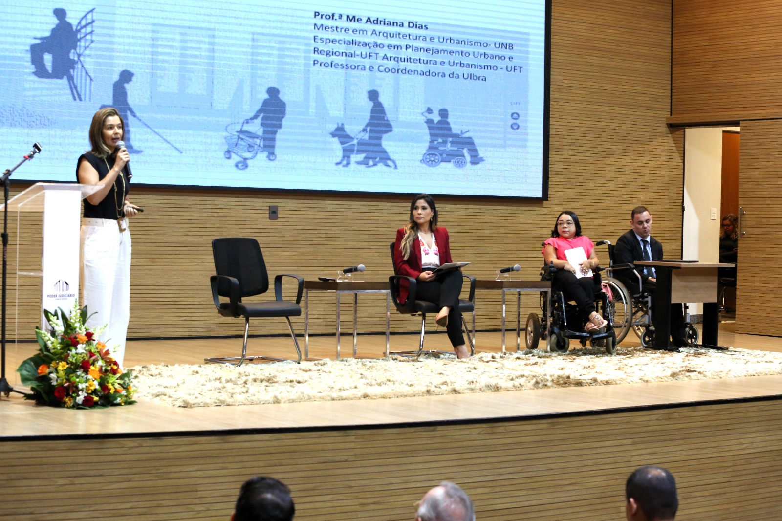 A segunda e última palestra foi sobre a arquitetura como promotora da inclusão e universalidade dos espaços para todos(as), com a arquiteta Adriana Dias, mestra e coordenadora do curso de Arquitetura do Centro Universitário de Palmas (Ceulp/Ulbra). Coordenando a Mesa, estavam as servidoras do TJTO Eva Portugal e Patrícia Idehara.