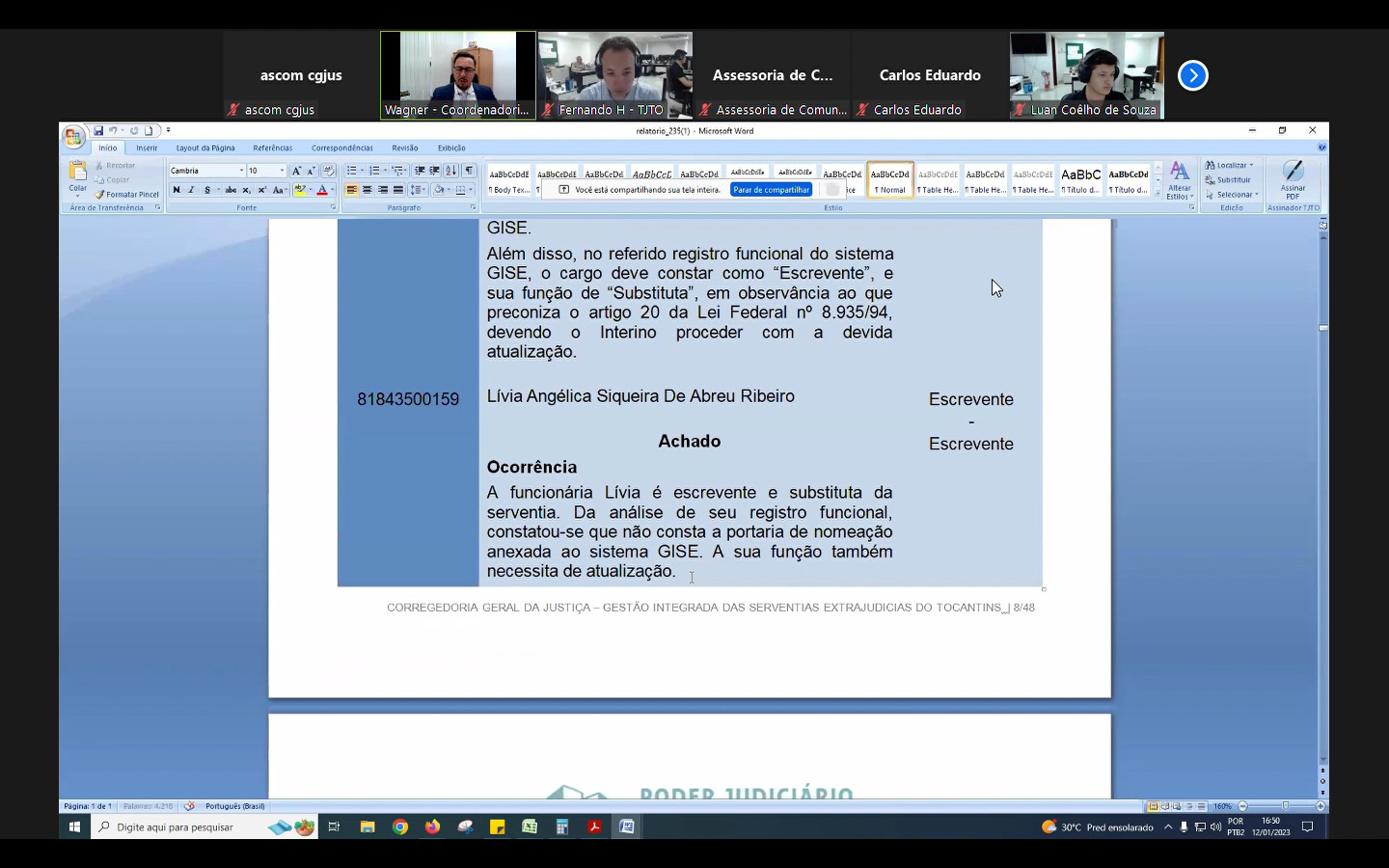 Os últimos avanços do sistema de Gestão Integrada das Serventias Extrajudiciais – Gise, foram apresentados aos servidores do Tribunal de Justiça do Estado do Maranhão (TJMA). O encontro foi realizado nesta última quinta-feira 12/01 por meio da plataforma Zoom, onde contou com a participação do coordenador dos Serviços Notariais e de Registro da CGJUS-TO, Wagner José dos Santos, e da equipe da diretoria de TI do TJTO, Luan Coelho, Fernando Henrique, Harly Varão.