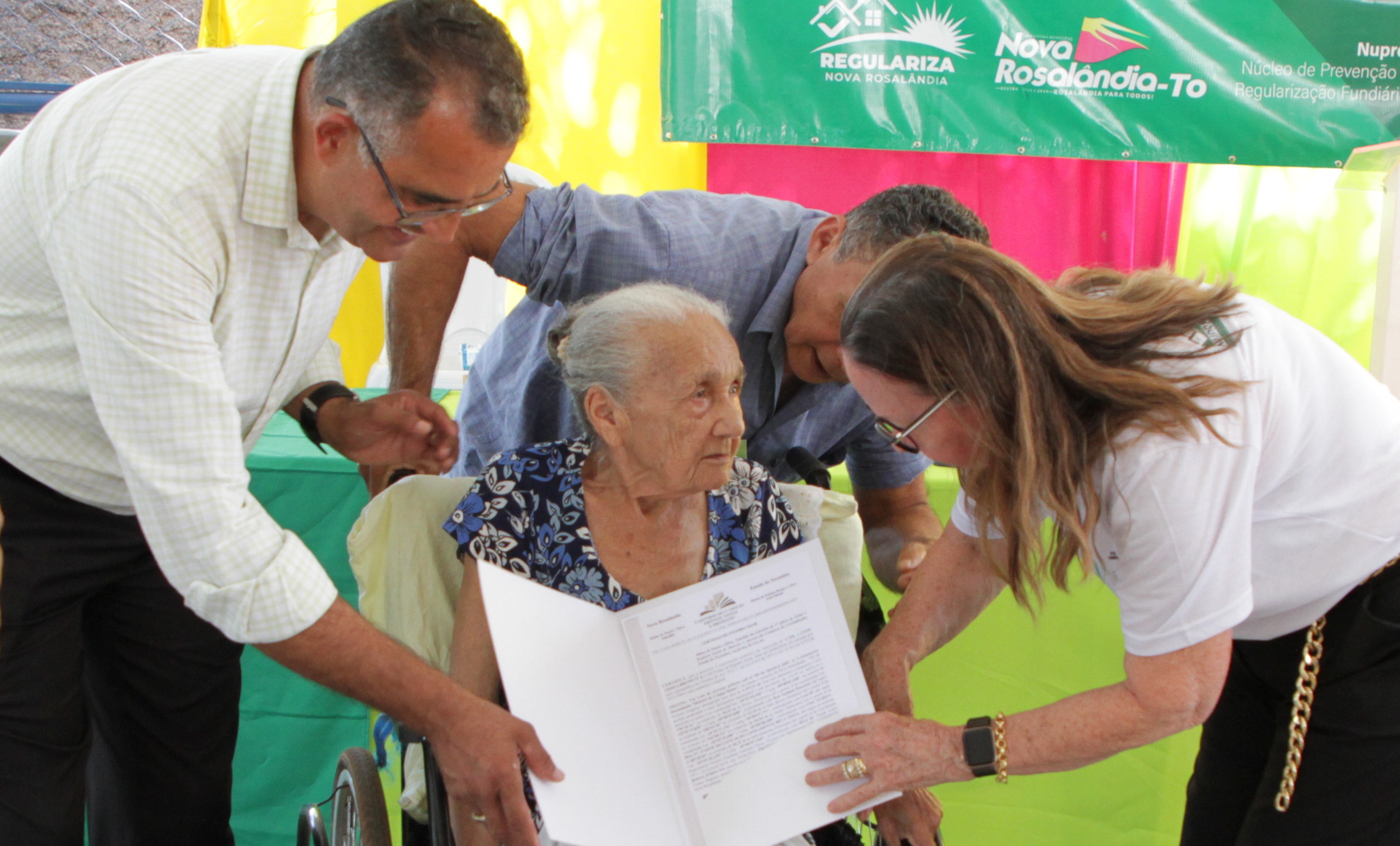 Fechando a programação, nesta sexta-feira (05/07) 53 famílias do distrito Campo Maior, município de Nova Rosalândia, receberam o documento definitivo do imóvel onde vivem. Dona Maria José Bezerra de Sousa, 86 anos, foi uma das pessoas beneficiadas. Apesar de já não enxergar mais devido a um problema de saúde, ela viu a esperança ser renovada ao receber o título de sua propriedade 24 anos após se mudar para o distrito. “Sonho realizado”, disse o filho de dona Maria, Demétrio Bezerra, ao  resumir o sentimento da família com a regularização do distrito.