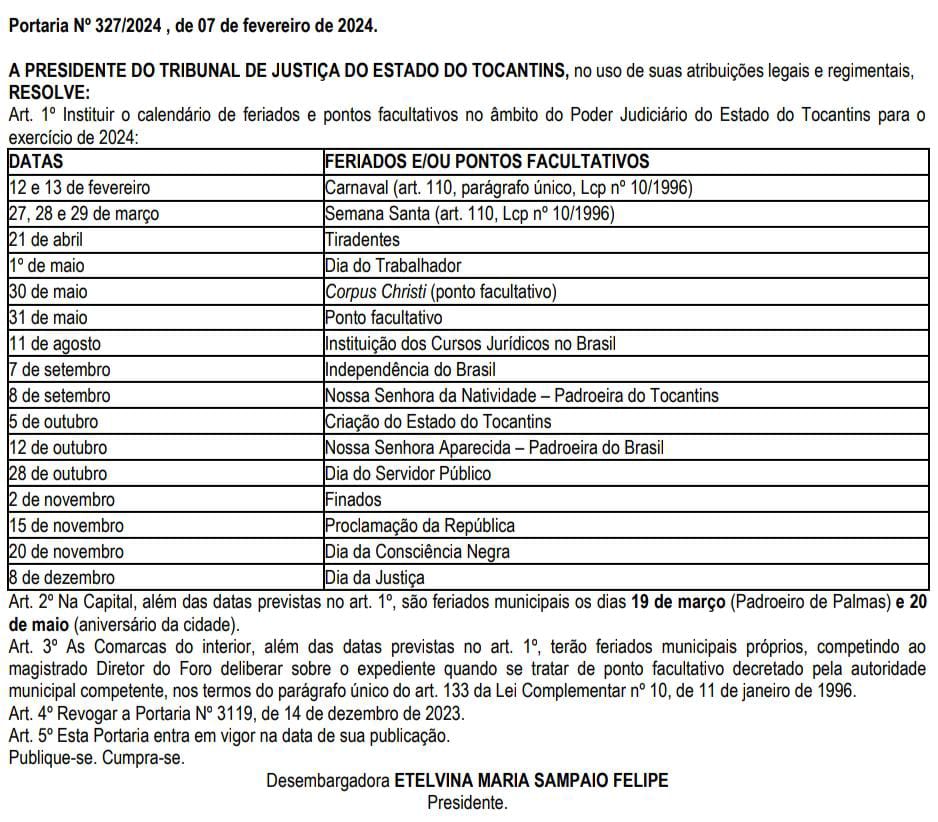 Por meio de Portaria publicada nesta sexta-feira (16/2), o Tribunal de Justiça do Tocantins (TJTO) instituiu o calendário de feriados e pontos facultativos no âmbito do Poder Judiciário do Tocantins para o exercício do ano de 2024.